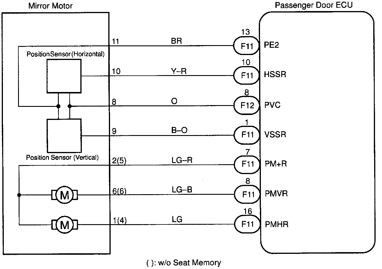 This position detected by the mirror position sensor will be memorized in the seat ECU. This sensor is equipped in the mirror in spite of the existence of the memory function.