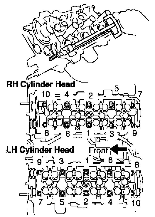 c. Install and uniformly tighten the 10 cylinder head bolts on one side of the cylinder head in several passes in the sequence shown, then do the other side as shown.