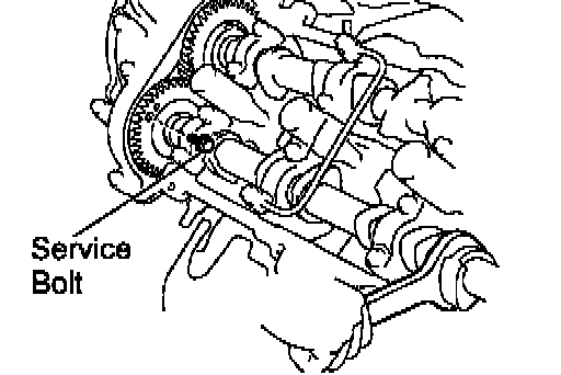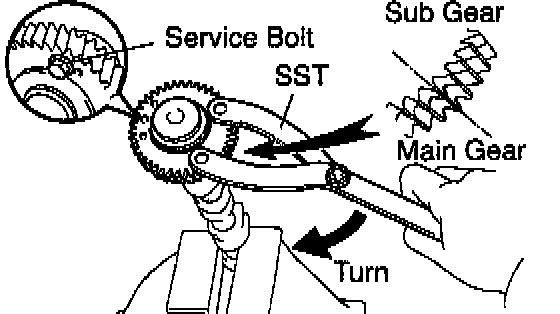 d. Using Special Service Tool (SST), align the holes of the camshaft main gear and sub gear by turning camshaft sugar counterclockwise, and temporarily install a service bolt.