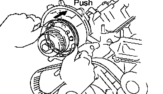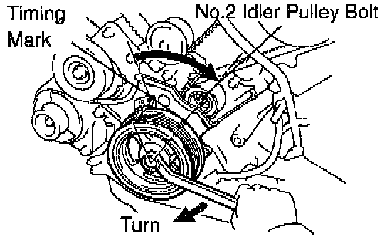 Turn the crankshaft pulley clockwise or counterclockwise, and put the timing mark of the crankshaft pulley in line with the centers of the crankshaft pulley bolt and idler pulley bolt.
