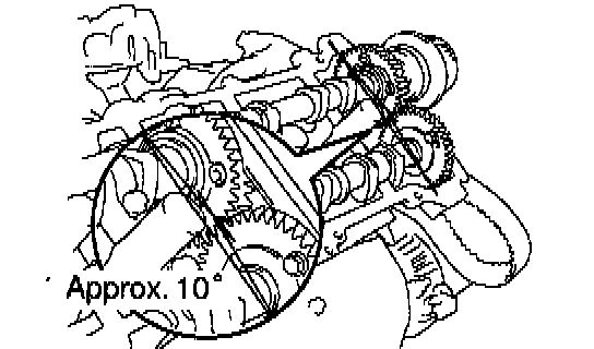 3) Set the timing mark (1 dot mark) of the camshaft main gear at approximately 10° angle.