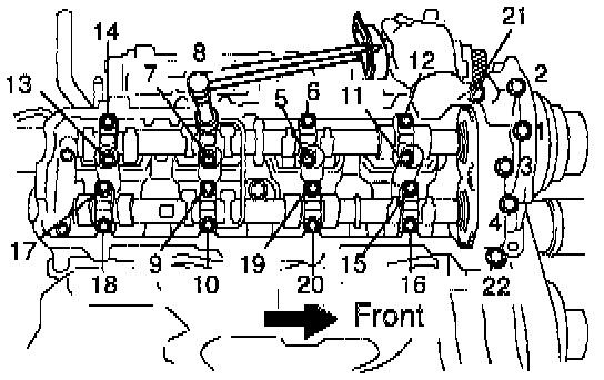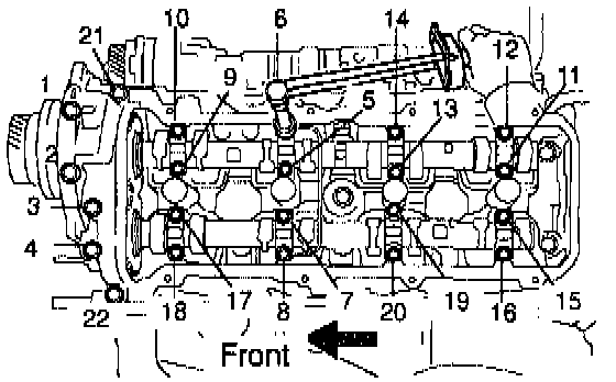 12) Uniformly tighten the 22 bearing cap bolts in several passes, in the sequence shown.