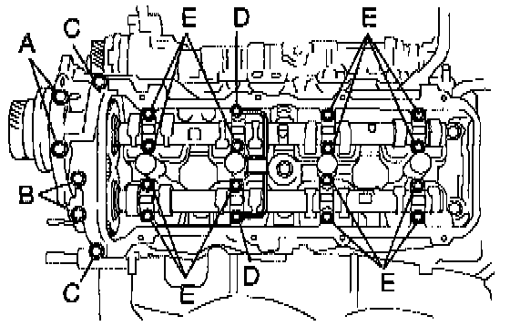 10) Apply a light coat of engine oil on the threads and under the heads (D and E) of the bearing cap bolts.