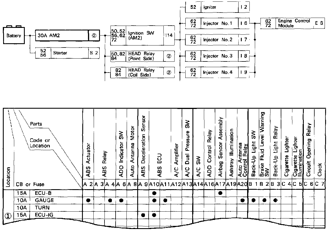 The chart shows the route by which current flows from the battery to each electrical source (Fusible Link, Circuit Breaker, Fuse, etc.) and other parts.