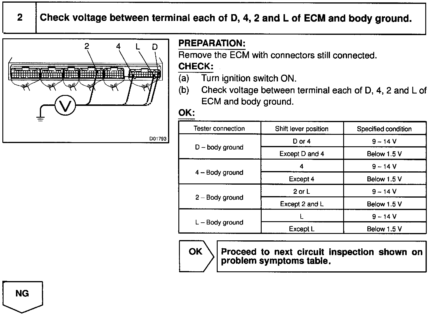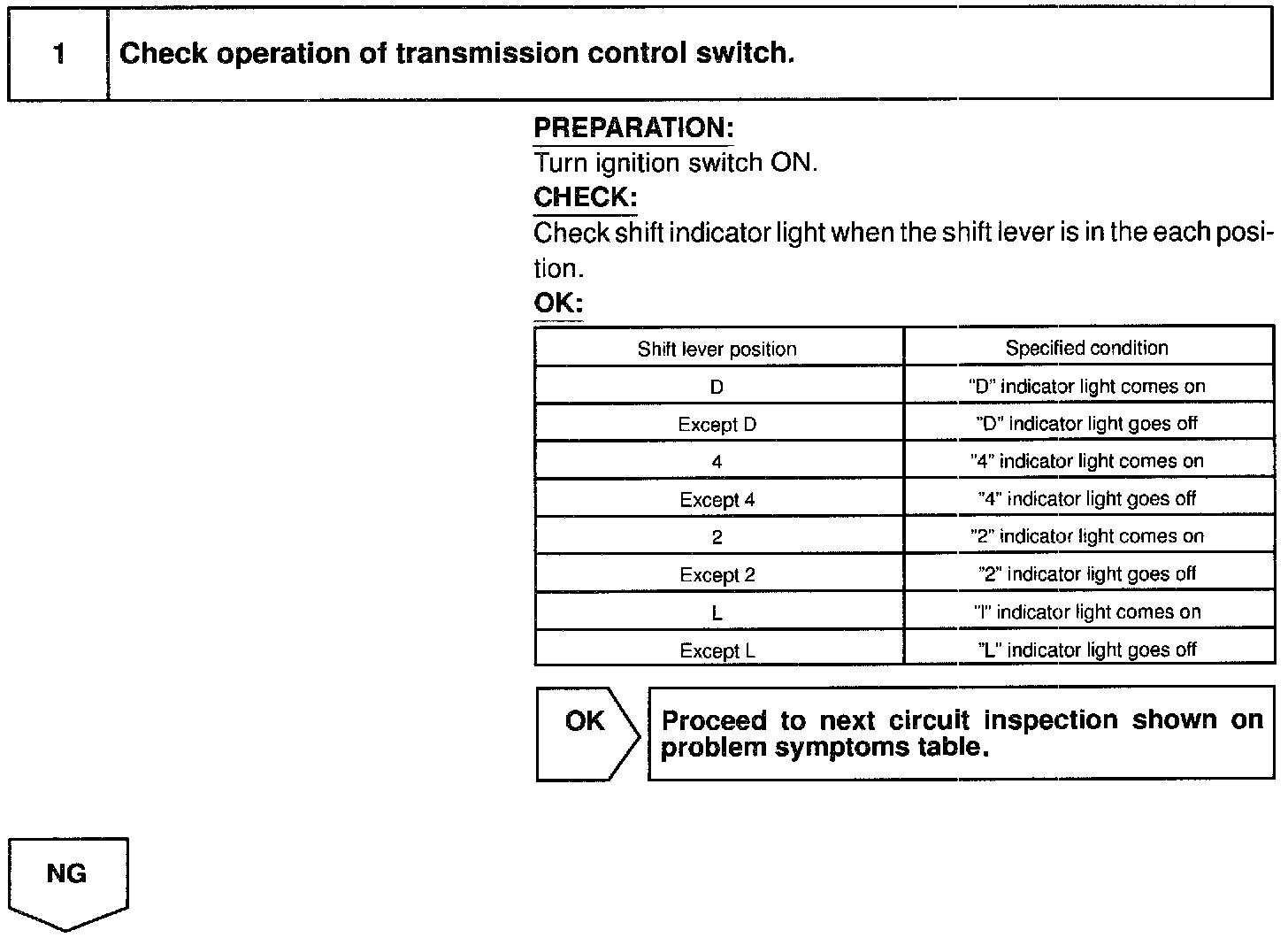 When the shift lever is in the L position (with transmission control switch for 2 and L is pressed), "L" in the shift position indicator light will come on and when the shift lever is in the 2 position (with transmission control switch for 2 and L is release), "2" in the shift position indicator light will come or.