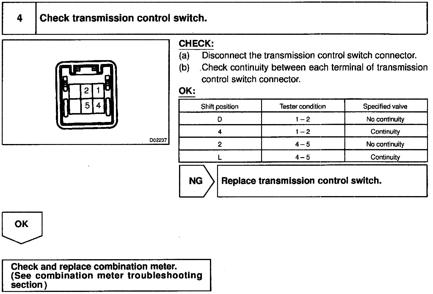 When the shift lever is in the 4 position (with transmission control switch for B and 4 is pressed), "4" in the shift position indicator light will come on and when the shift lever is in the B position (with transmission control switch for D and 4 is released), "B" in the shift position indicator light will come on.