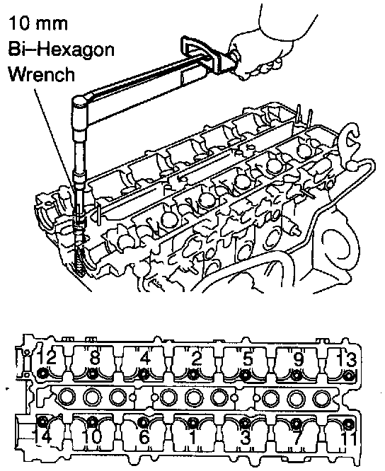 c. Using a 10 mm bi-hexagon wrench, uniformly tighten the cylinder head bolts, in several passes, in the sequence shown.