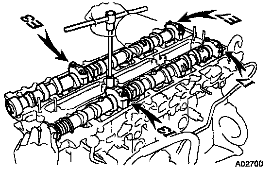 m. Using a 5 mm hexagon wrench, the 2 No.3 camshaft bearing cap bolts.