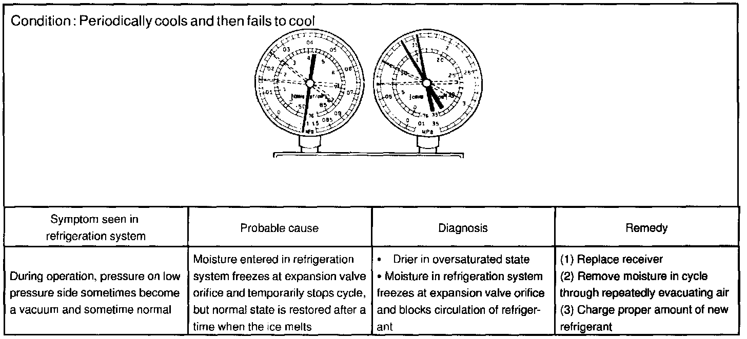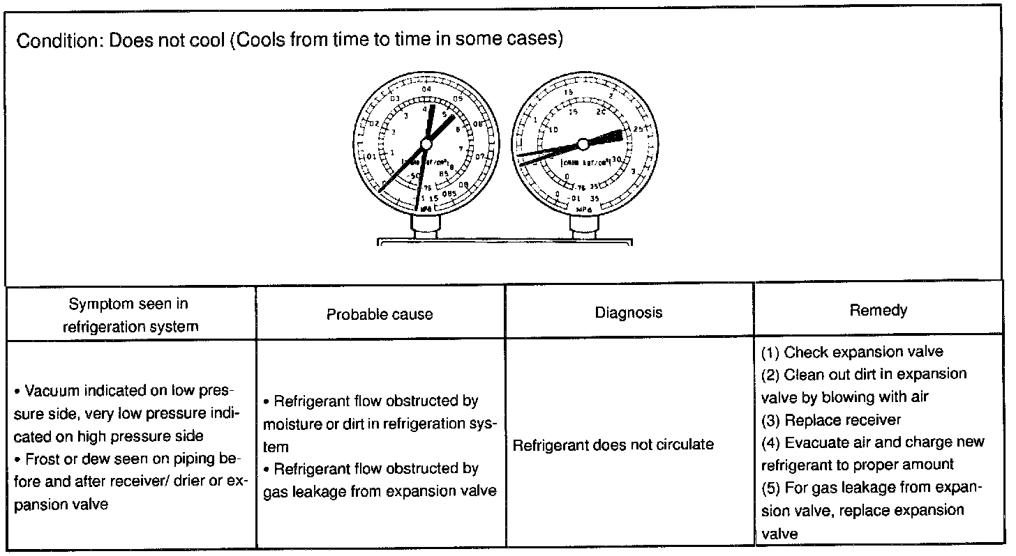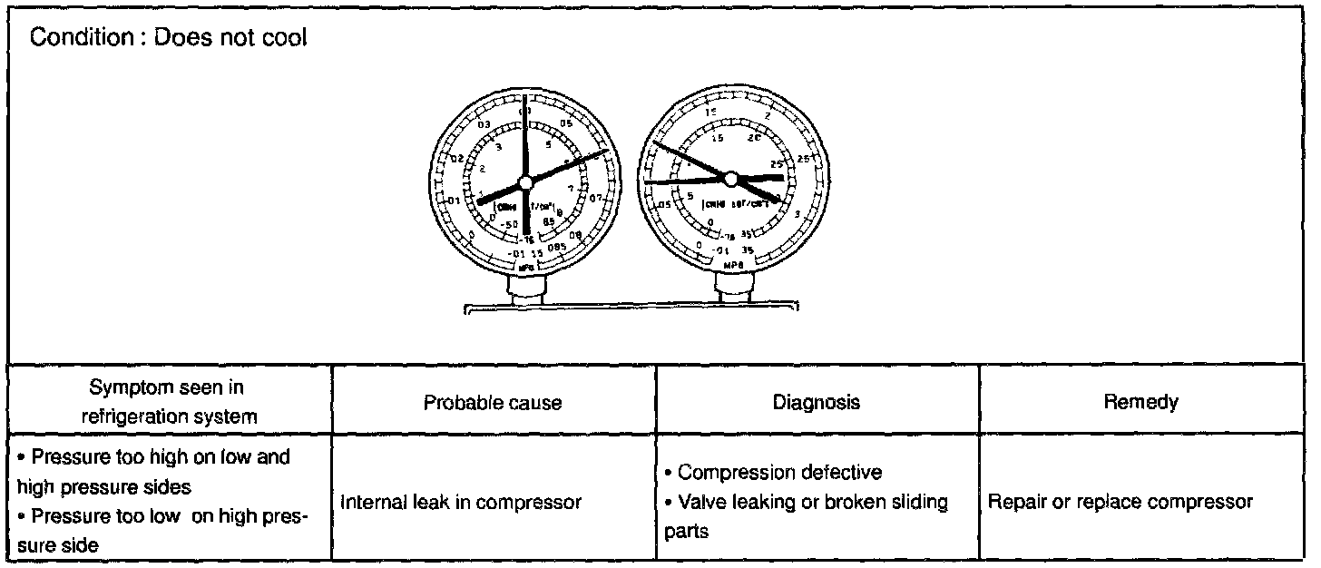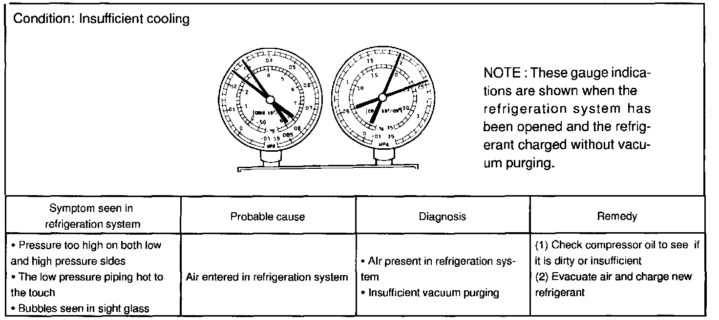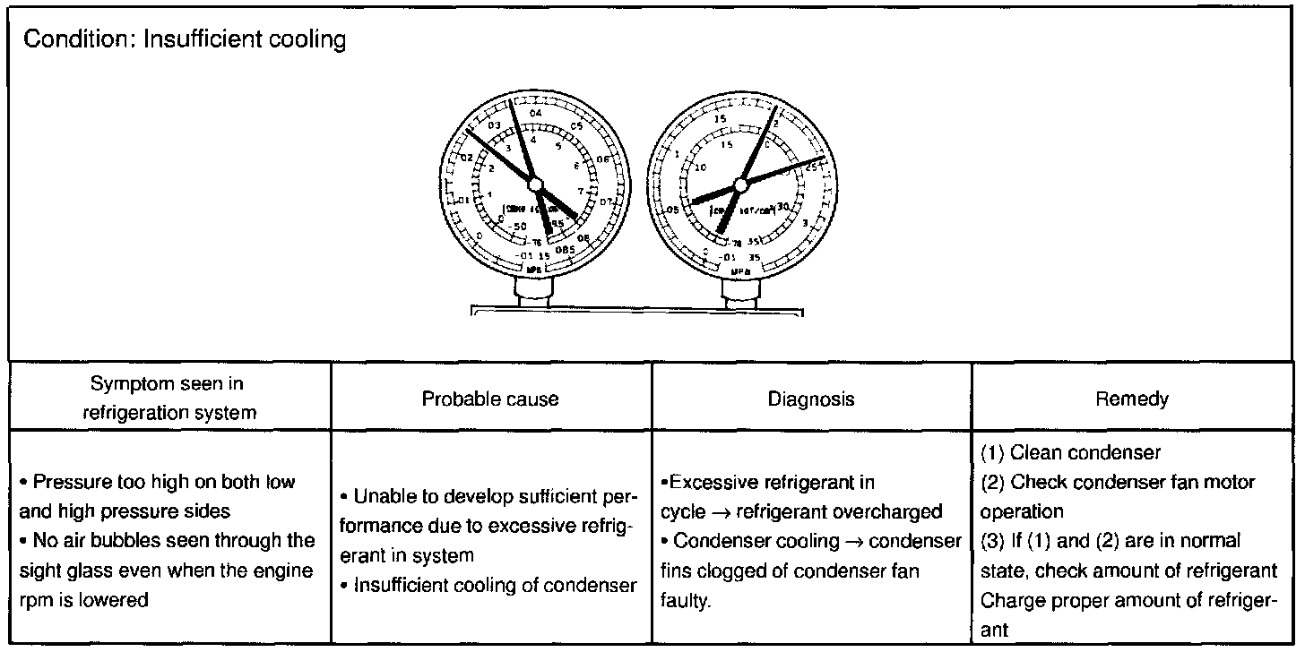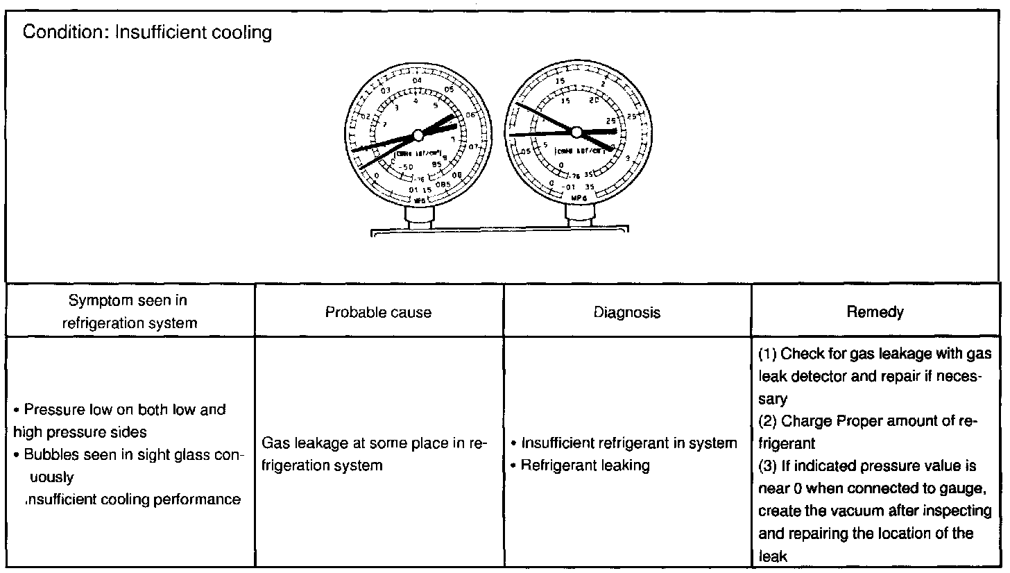 This is a method in which the trouble is located by using a manifold gauge set. Read the manifold gauge pressure when these conditions are established.