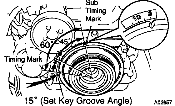 c. Turn the crankshaft pulley 60° counterclockwise to place the sub timing mark (60° mark BTDC) on the crankshaft pulley at the timing mark "0" position of the No. 1 timing belt cover.