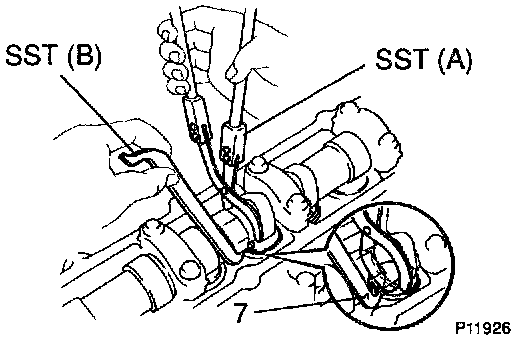 - Press down the valve lifter with SST (A), and remove SST (B).