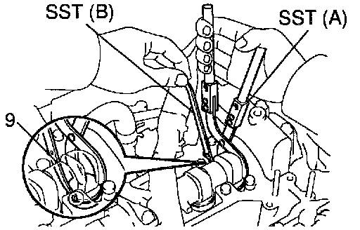 - Using SST (A), press down the valve lifter and place SST (B) between the camshaft and valve lifter. Remove SST (A).