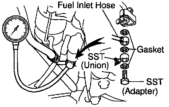 (d) Install the fuel inlet hose and SST (pressure gauge) to the fuel pipe support with the 3 gaskets and SST (union and adapter). SST O9268-5O14 (O9268-4119O, 90405-06167)