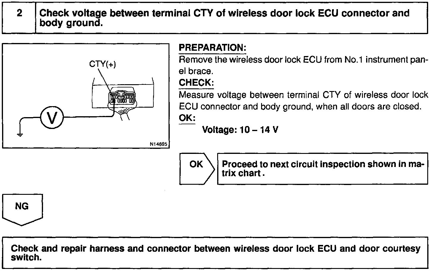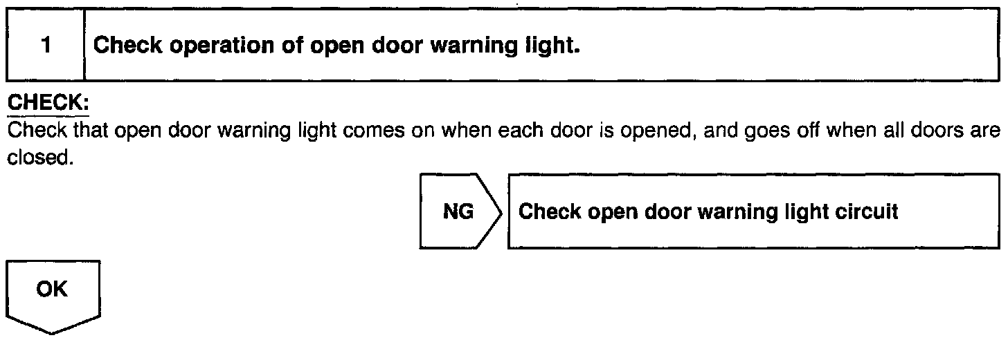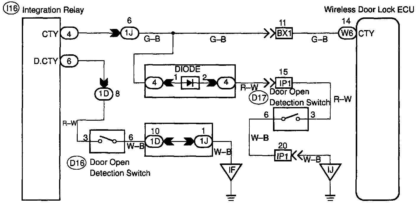 The door courtesy switch comes ON when the door is opened and goes OFF when door is closed. Furthermore. the door courtesy switch circuit has terminal +B connected inside the theft deterrent ECU. Battery positive voltage is applied to terminal DSWD of the theft deterrent ECU when all doors are closed, i.e., when the door courtesy switches of all doors are OFF.