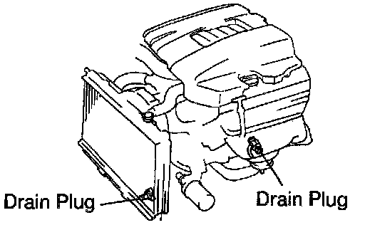 b. Remove the 2 drain plugs on the engine and radiator, and drain the coolant. Close the 2 drain plugs.