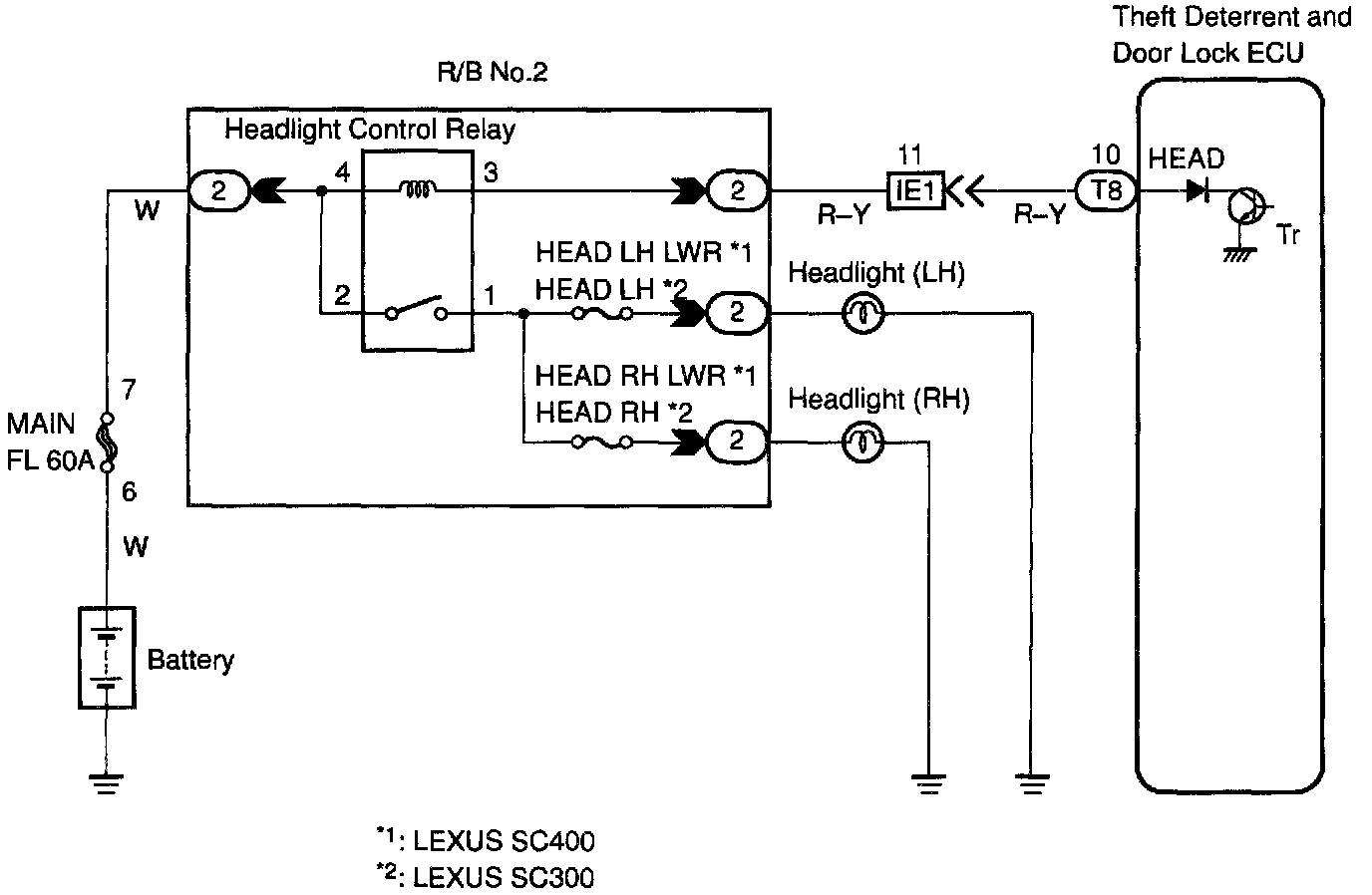 When the theft deterrent system is activated, it causes the Tr in the ECU to switch on and off at approximately 0.4 sec. intervals. This switches the headlight control relay on and off, thus flashing the headlights (See the wiring diagram below).