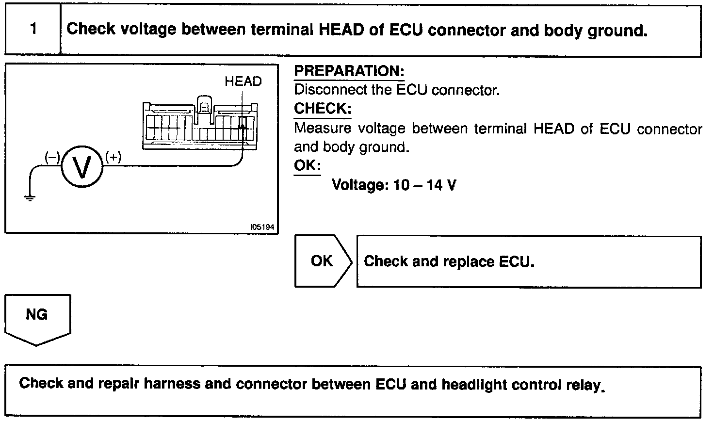 HINT: The flow chart above is based on the premise that the headlights light up normally whenever the light control switch is operated. If headlight operation is not normal when the light control switch is operated, proceed to headlight troubleshooting.