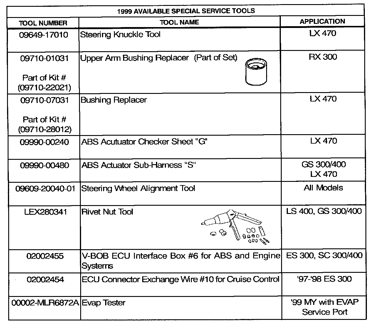This TSIB contains information regarding Special Service Tools (SSTs) distributed or added to the SST program during 1999 model year. Both the Essential and Available SSTs are listed by tool number, tool name, and model application.
