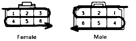 E: Indicates the wiring harness and wiring harness connector. The wiring harness with male terminal is shown with arrows. Outside numerals are pin numbers.