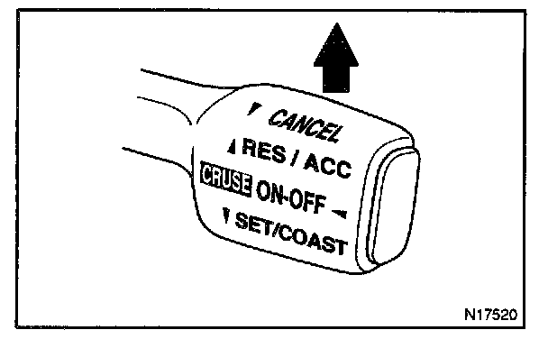 3. Check that the vehicle speed is increases while the control switch is turned to RES/ACC, and that the vehicle cruises at the set speed when the switch is released.