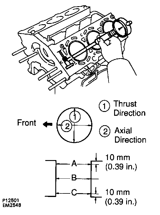 Using a cylinder gauge, measure the cylinder bore diameter positions A, B and C in the thrust and axial directions.