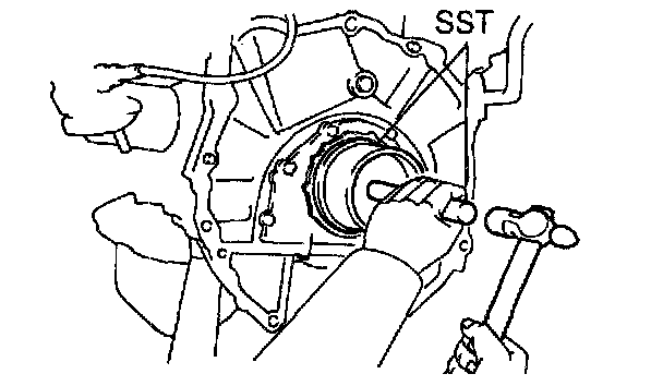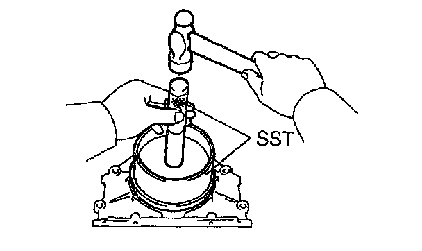 2) Using SST and a hammer, tap in a new oil seal until its surface is flush with the rear oil seal retaining edge.