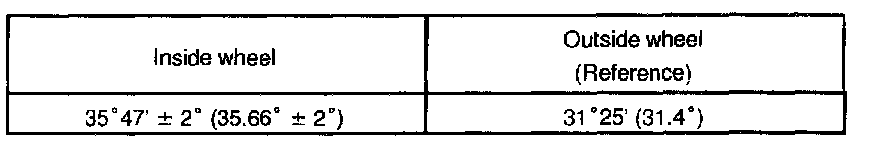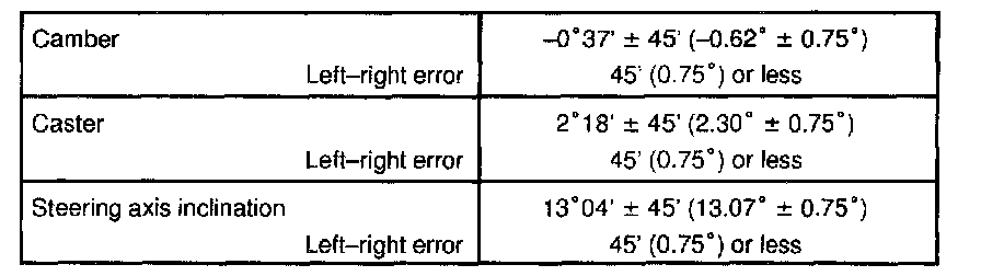 If the caster and steering axis inclination are not within the specification, after the camber has correctly adjusted, recheck the suspension parts for damaged and/or worn out parts.