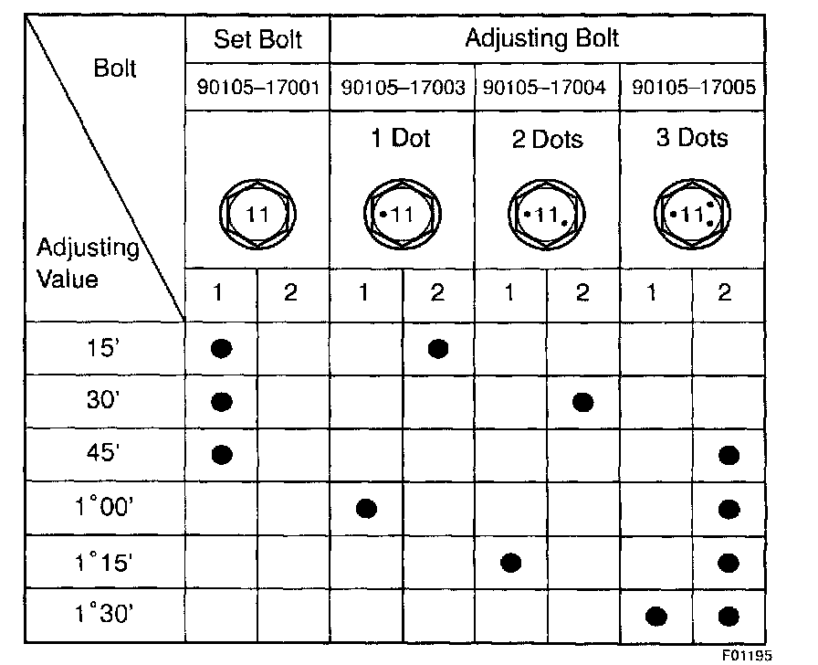 If the camber is not within the specification, using the table be low, estimate of how much additional camber adjustment will be required, and select the camber adjusting bolt.