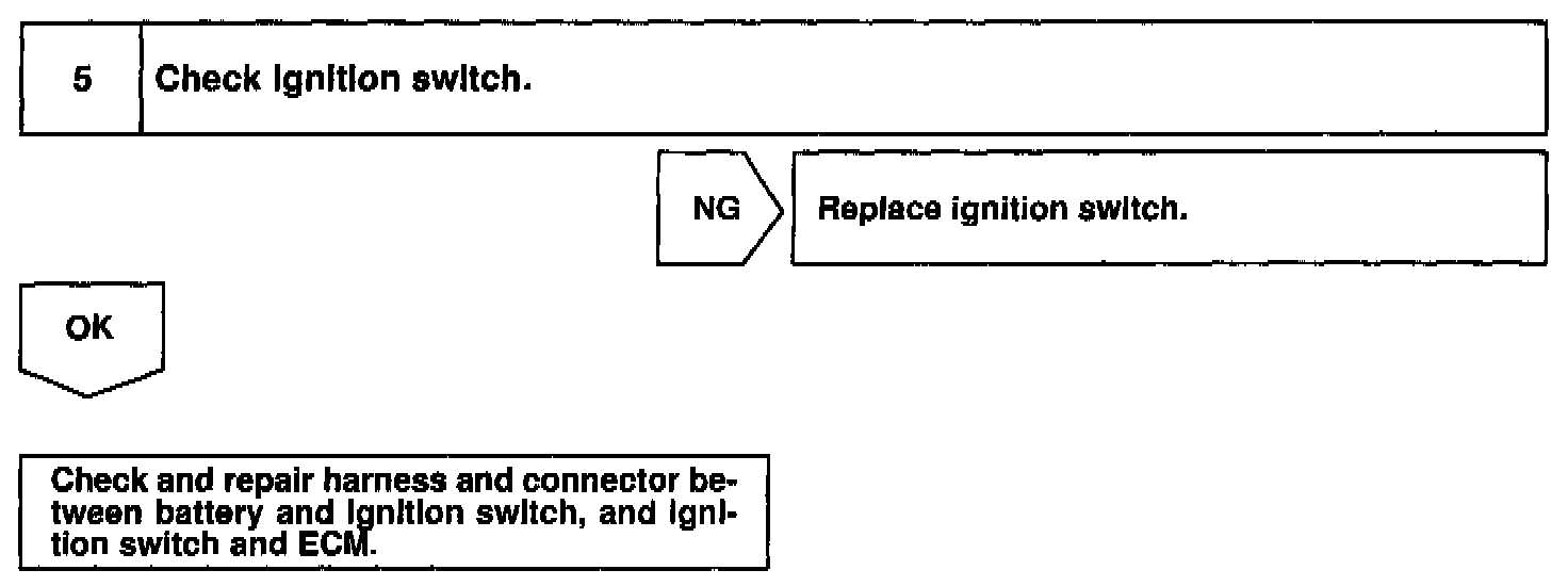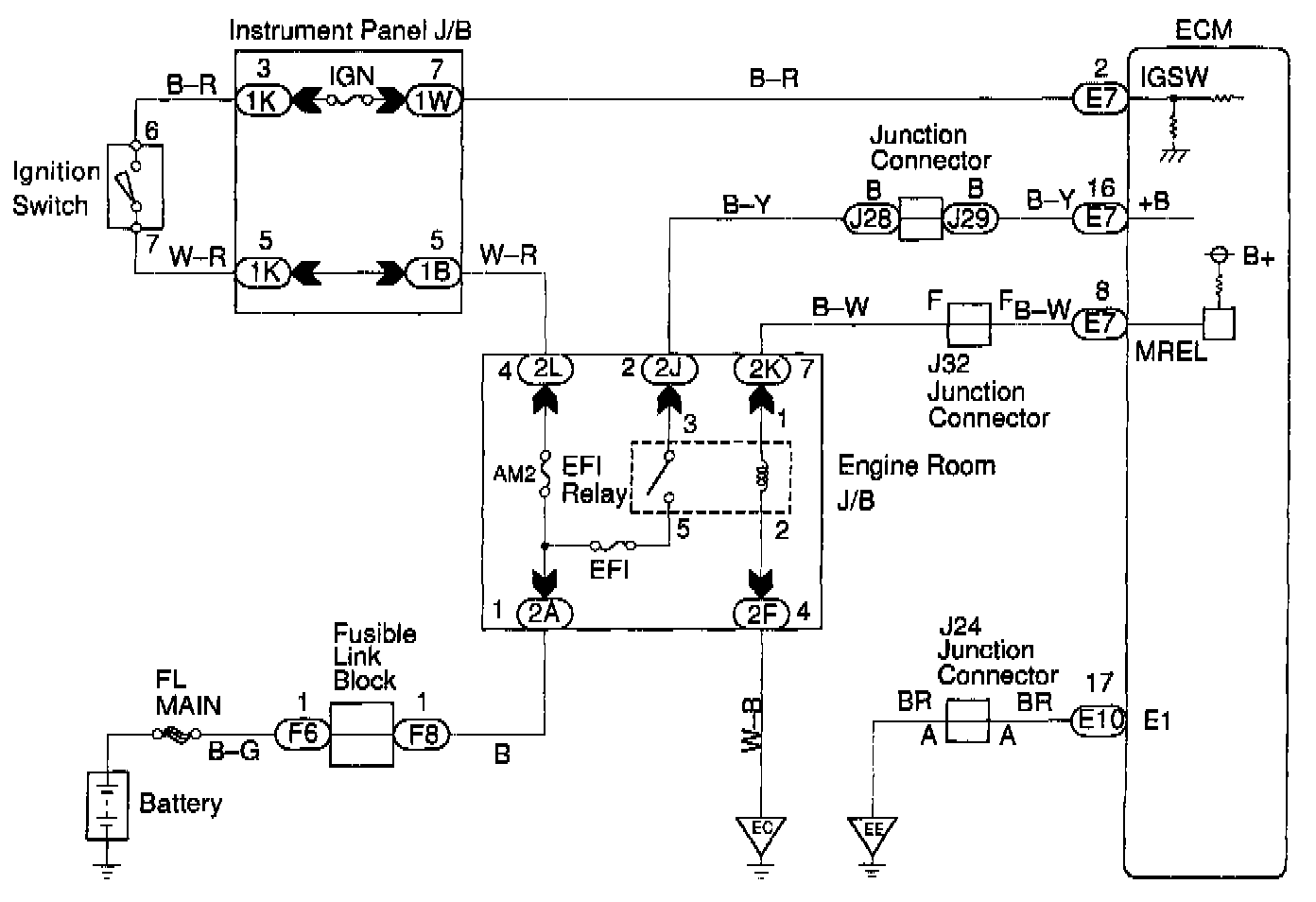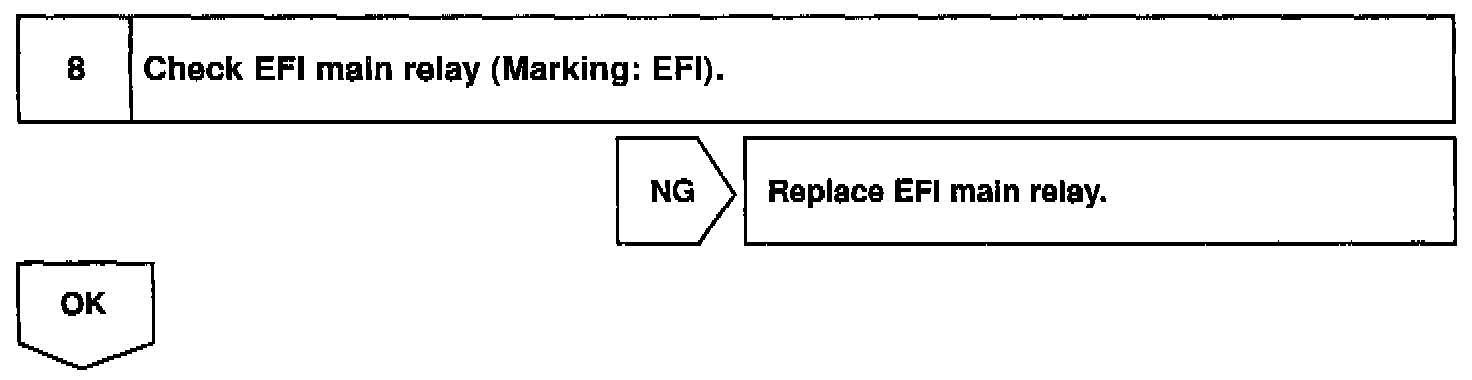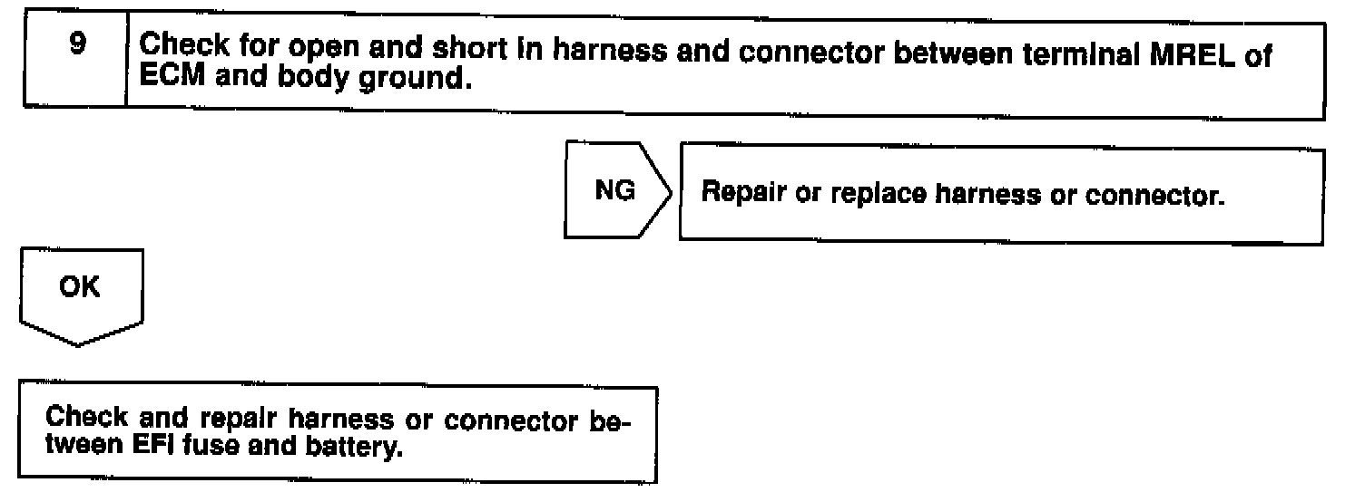 CIRCUIT DESCRIPTIONWhen the ignition switch is turned ON, battery positive voltage is applied to terminal IGSW of the ECM and the EFI main relay (Marking: EFI) control circuit in the ECM sends a signal to terminal MREL of the ECM switching on the EFI main relay.
