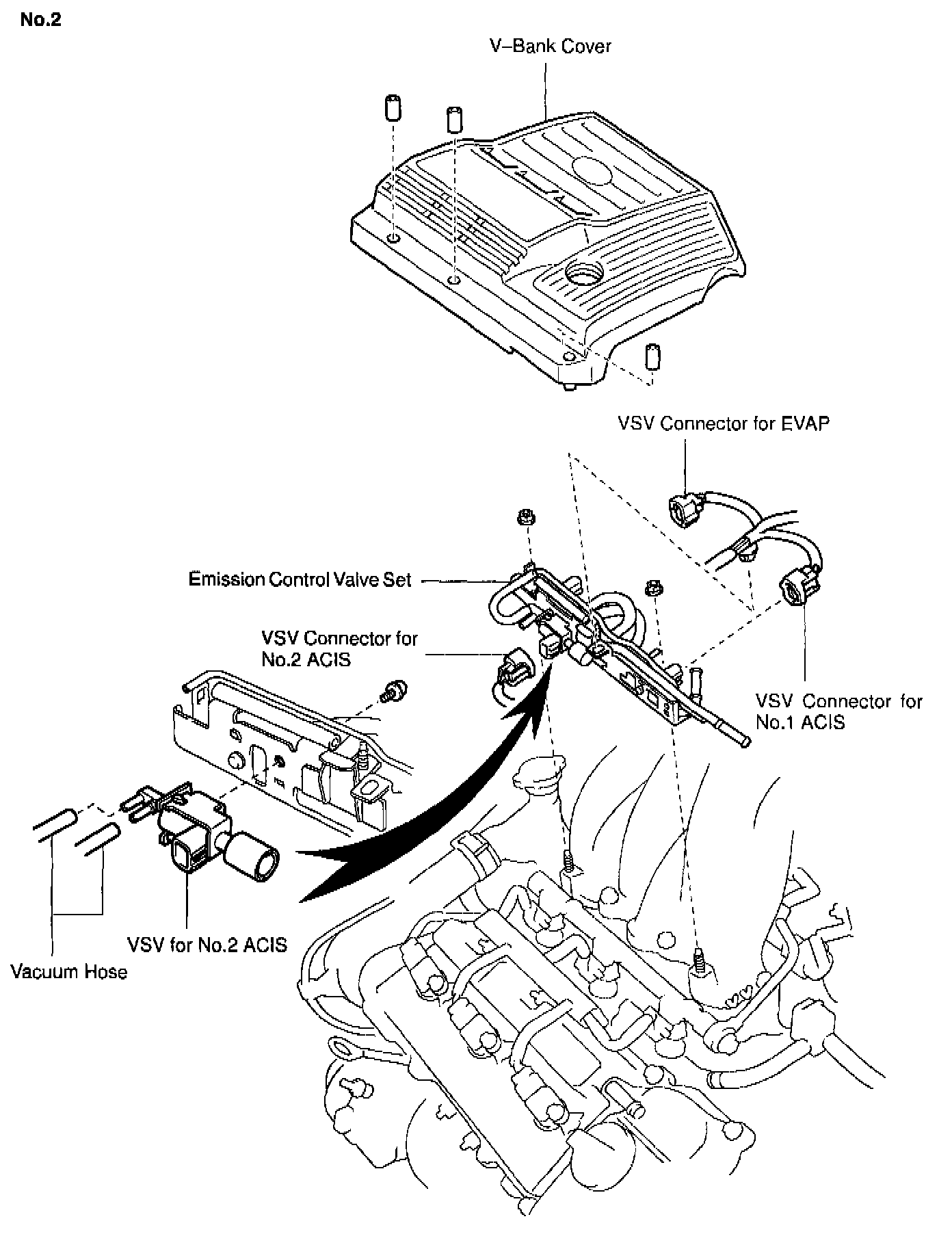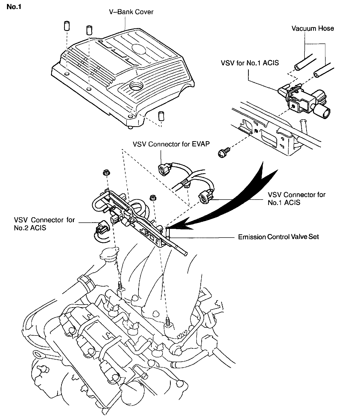 1. REMOVE V-BANK COVER, AND EMISSION CONTROL VALVE SET