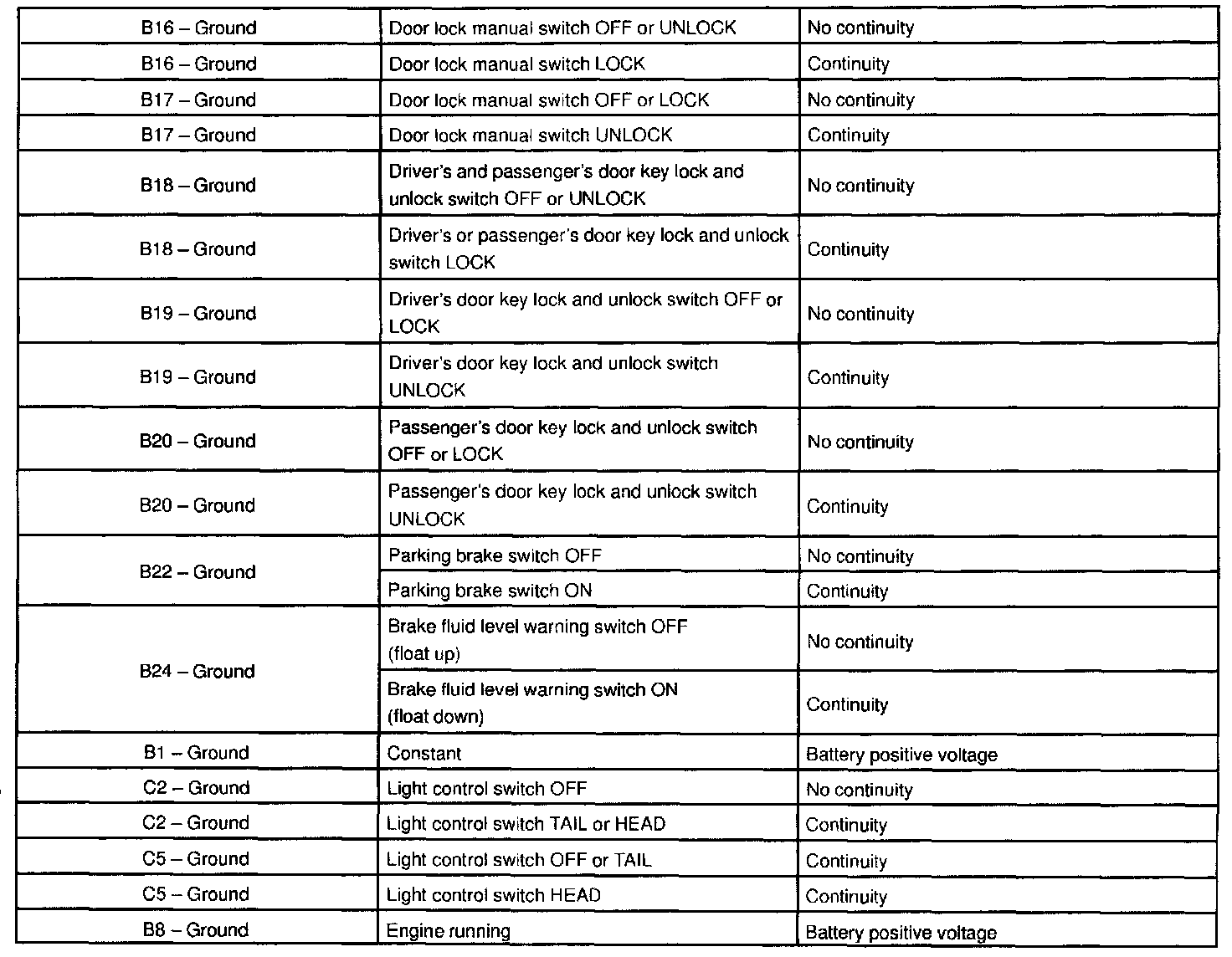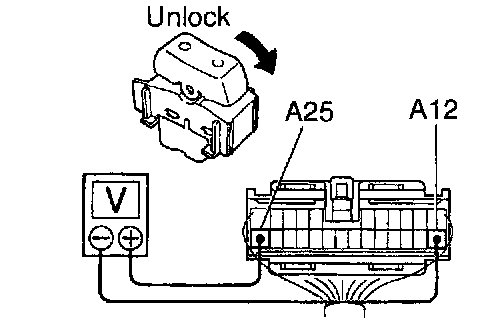 b. Set the door lock control switch to UNLOCK and check that the voltage rises from 0 V to battery positive voltage for approximately 0.2 seconds.