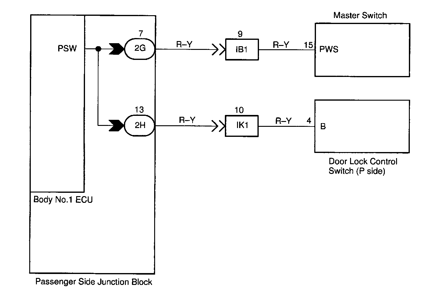 This circuit is the power source of the master switch for the driver's door and the door lock switch for the passenger's doors.