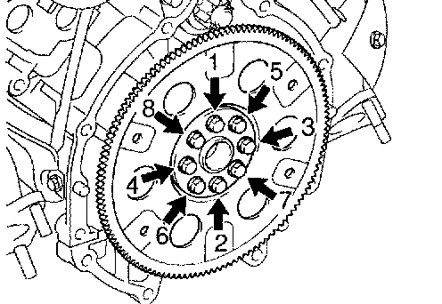Remove the 8 bolts, front spacer, drive plate and rear spacer.