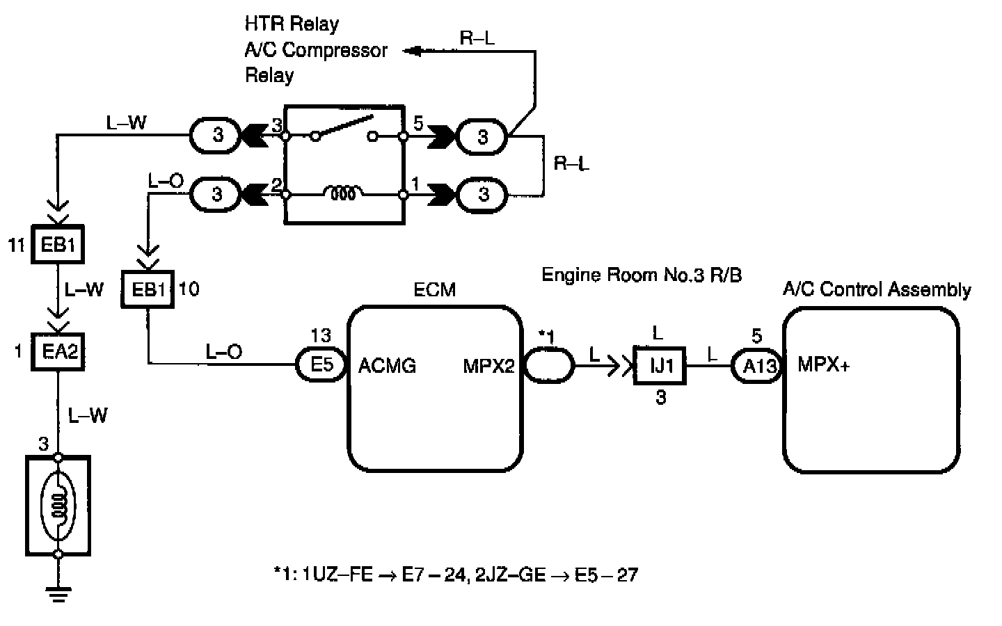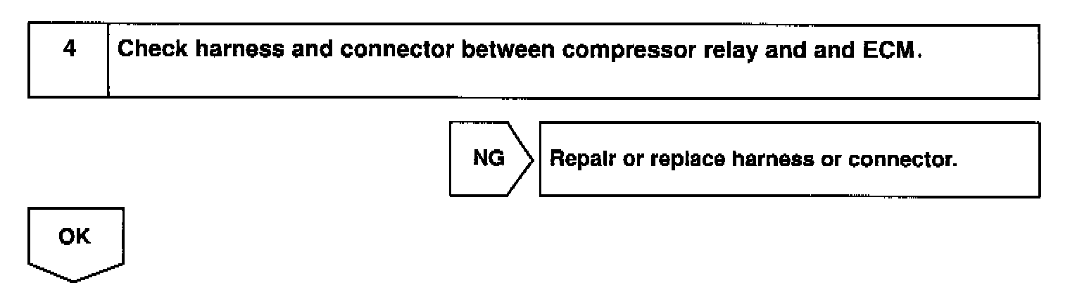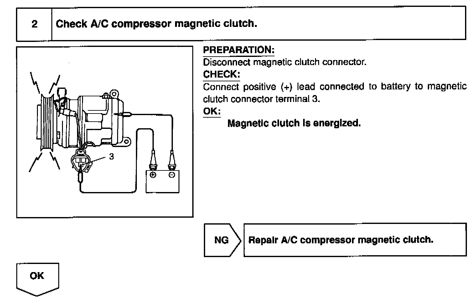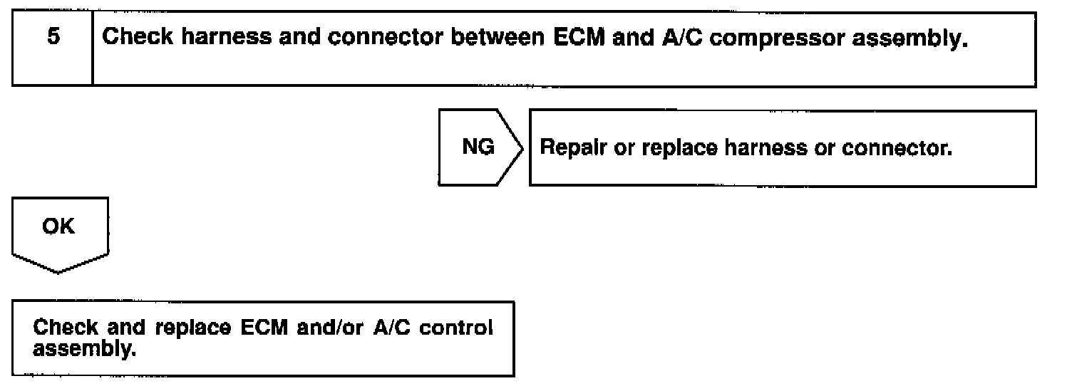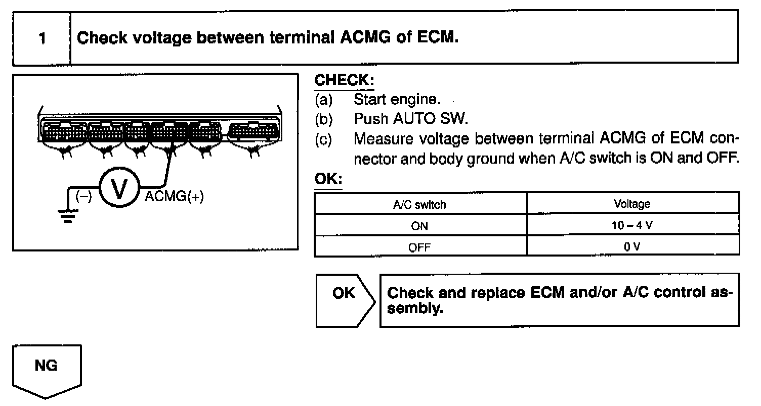 CIRCUIT DESCRIPTIONThe A/C control assembly outputs the magnetic clutch ON signal from terminal MGC to the ECM. When the ECM receives this signal, it sends a signal from terminal ACMG and switches the A/C magnetic clutch relay ON, thus turning the A/C compressor magnetic clutch ON.