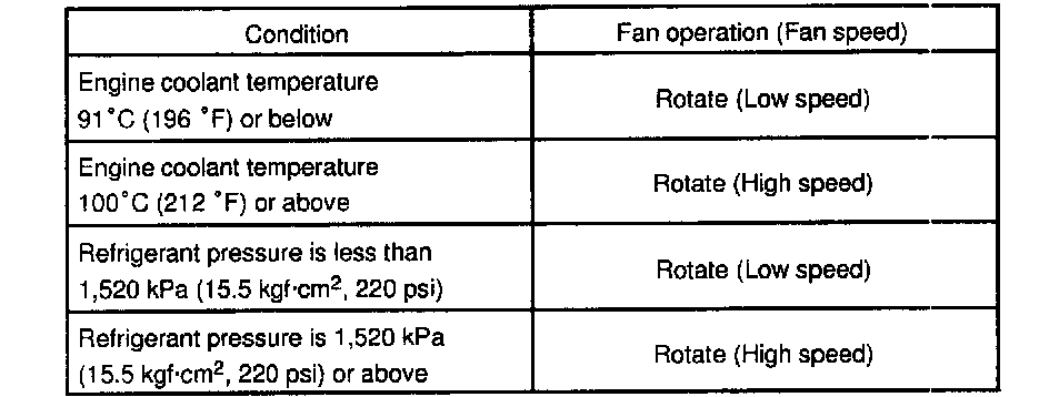 - If operation is as specified, check the pressure switch, cooling fan relays and engine coolant temp. switch.