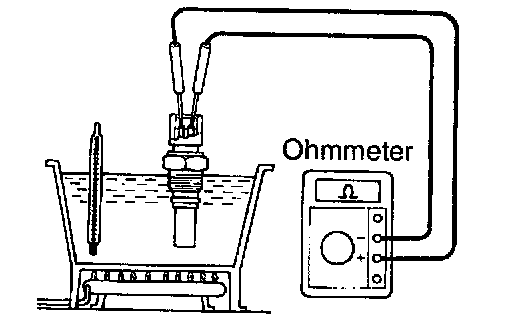 a. Using an ohmmeter, check that no continuity exists between the terminals when the coolant temperature is above 100°C (212 °F).