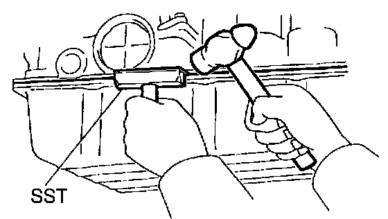 b. Install the blade of SST between the transmission case and oil pan, cut off applied sealer, and remove the oil pan.