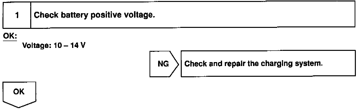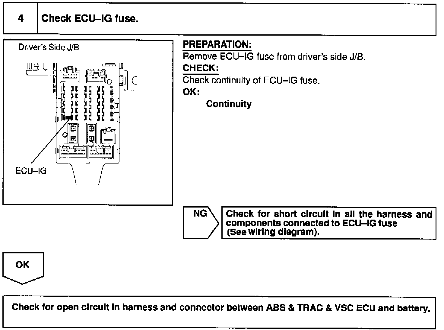 If trouble occurs in the power source circuit, the ECU cuts off current to the ABS solenoid relay and prohibits