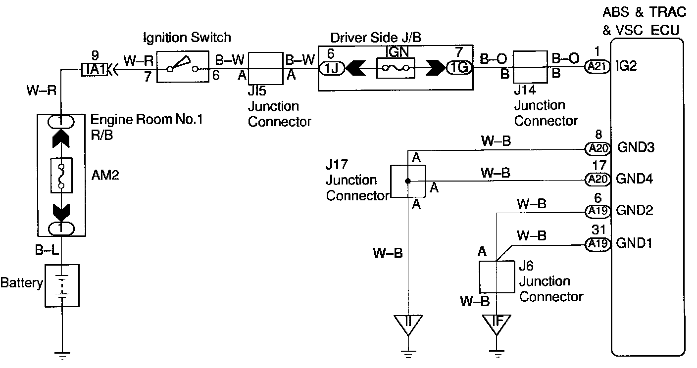 If trouble occurs in the power source circuit, the ECU cuts off current to the ABS solenoid relay and prohibits
