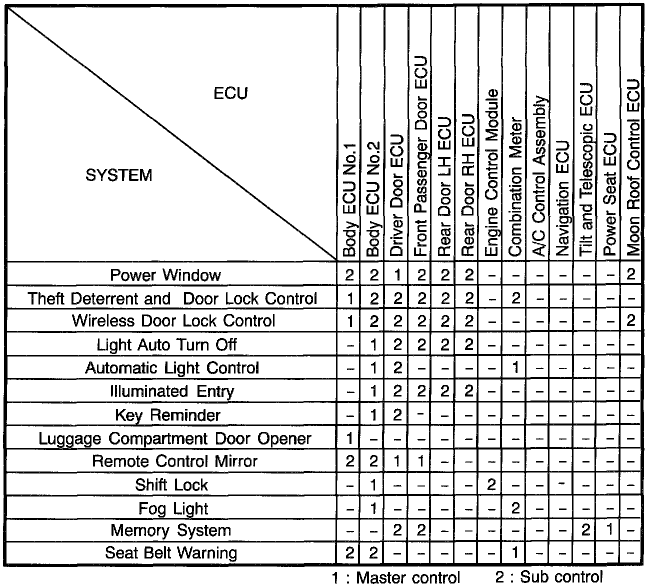 The system is comprised of the communication modes of the body ECU No.1, body ECU No.2, driver door ECU, front passenger door ECU, rear door LH ECU, rear door RH ECU, engine control module, combination meter, A/C control assembly, navigation ECU, tilt and telescopic ECU, power seat ECU and moon roof control ECU. The body electrical systems are controlled by a serial communication in which each ECU is linked to another via a single communication line. This system is also equipped with a self-diagnosis function.