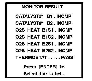 (e) Select from the tester menus: DIAGNOSIS, ENHANCED OBD II, MONITOR INFO and MONITOR RESULT. The monitor result appears after the component name.