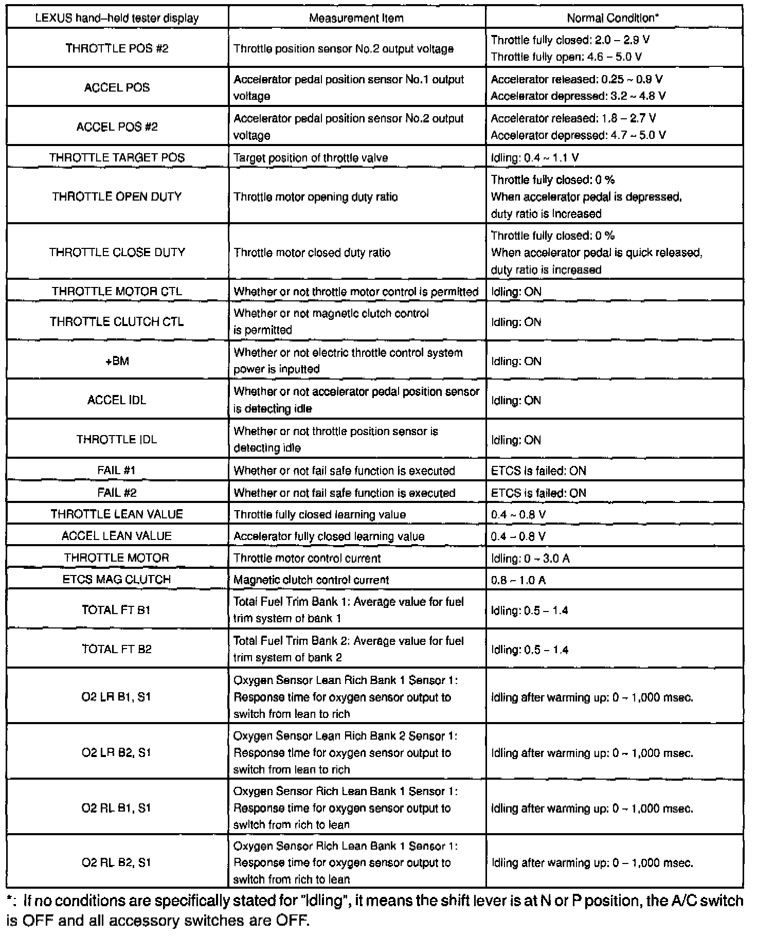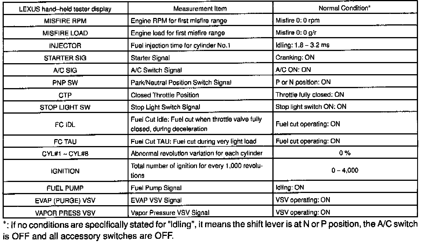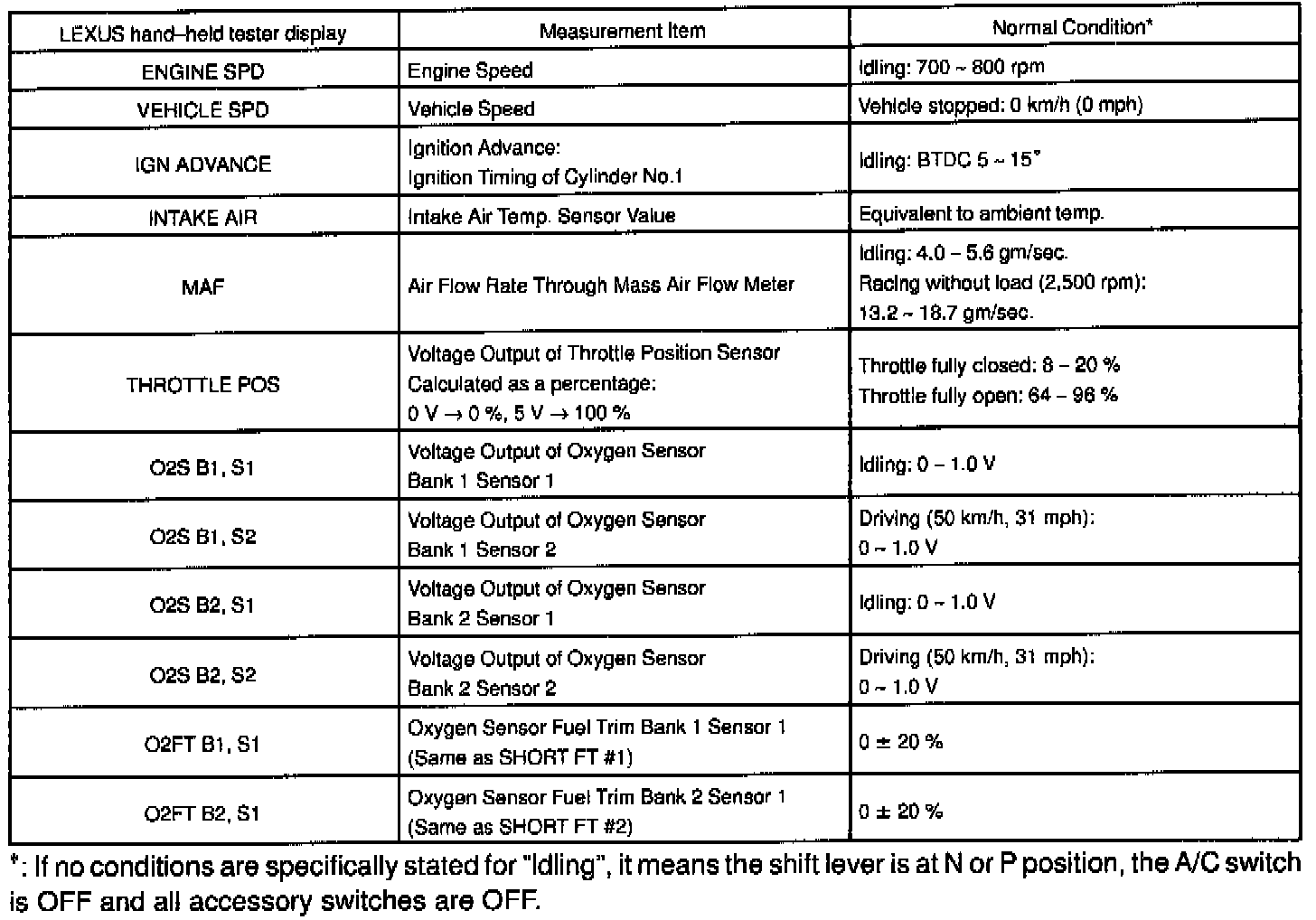 NOTE: The values given below for "Normal Condition" are representative values, so a vehicle may still be normal even if its value varies from those listed here. So do not decide whether a part is faulty or not solely according to the "Normal Condition" here.