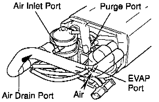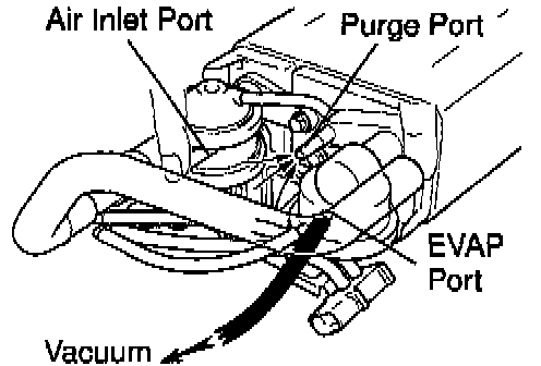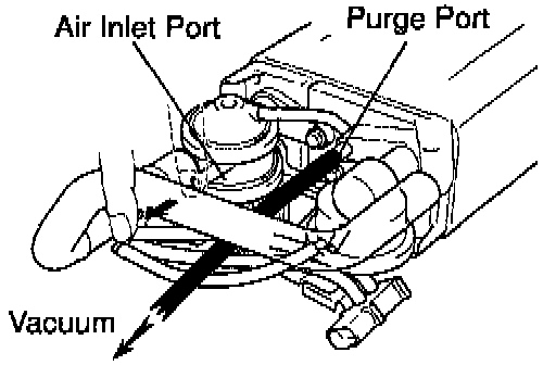 4. While holding the air inlet port closed, apply vacuum (3.43 kpa, 25.7 mmHg, 1.01 in.Hg) to the EVAP port and check that air flows into the purge port.