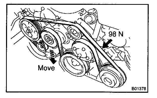 1. Check that the belt tensioner moves downward when the drive belt is pressed down at the points indicated in the illustration with approx. 98 N (10 kgf, 22.0 lbf) of force.