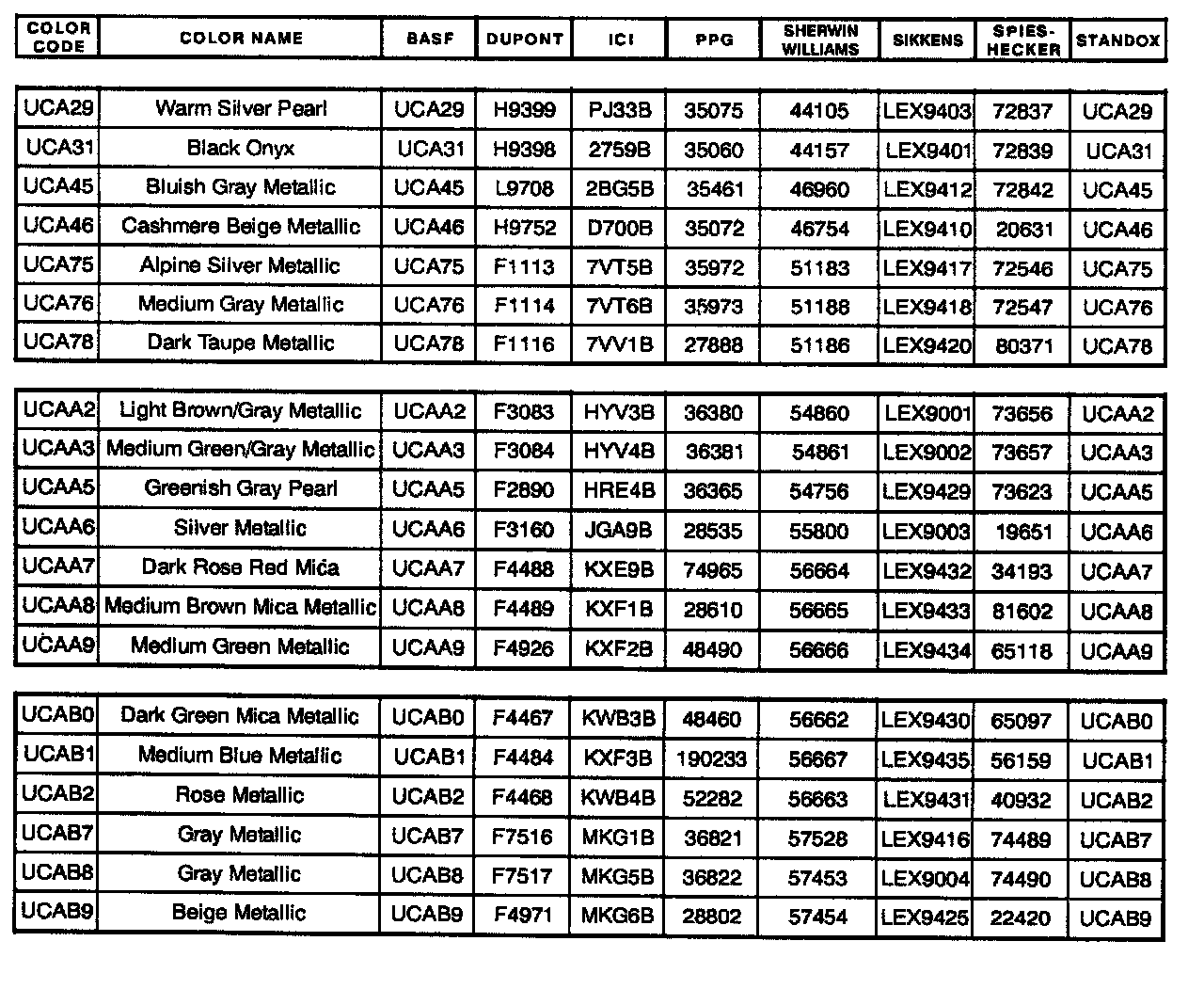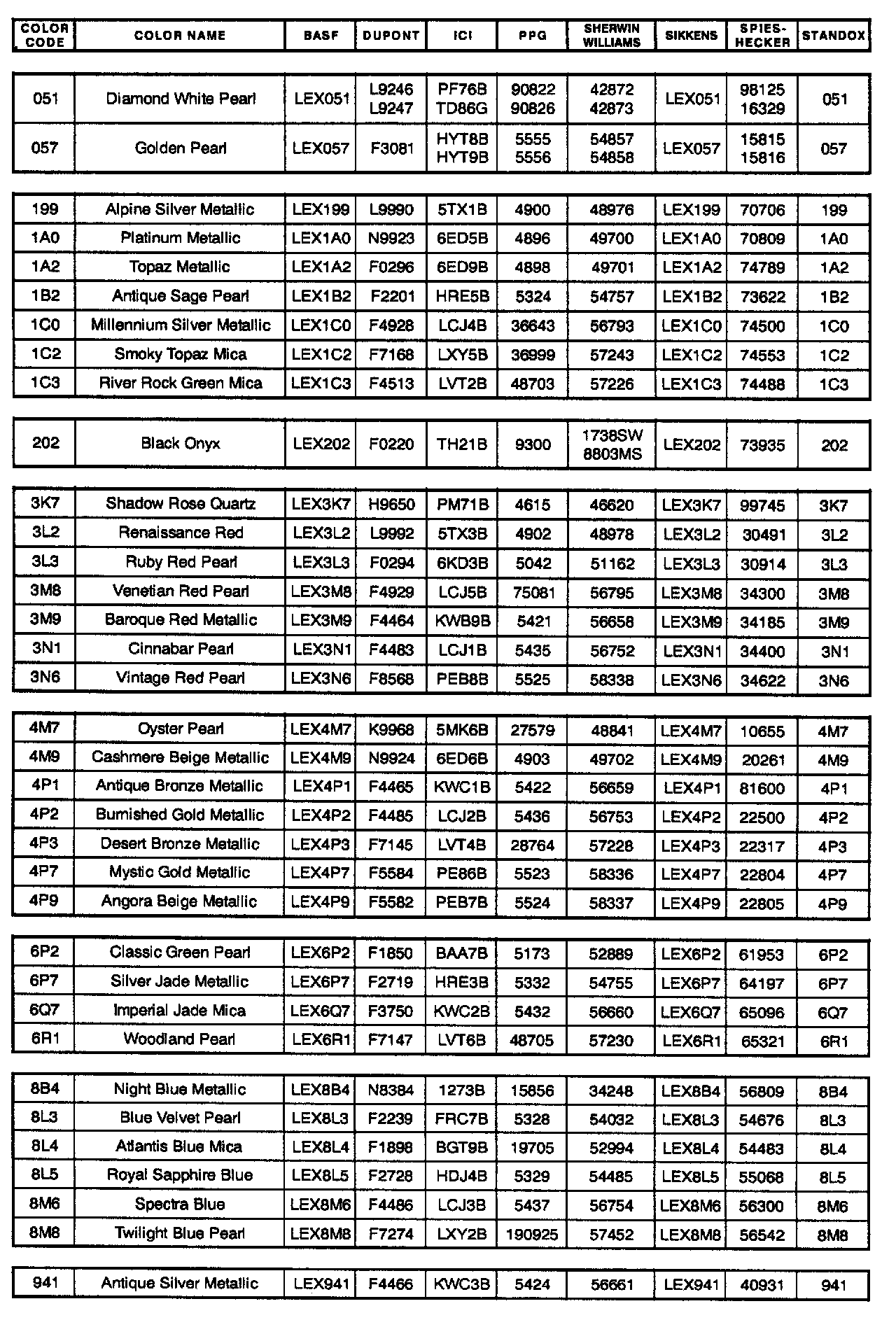 The following is a listing of all 1998 & 1999 Lexus paint codes and corresponding refinish formula codes for 8 (eight) refinish paint companies -- BASF, DuPont, ICI, PPG, Sherwin Williams, Sikkens, Spies Hecker and Standox.
