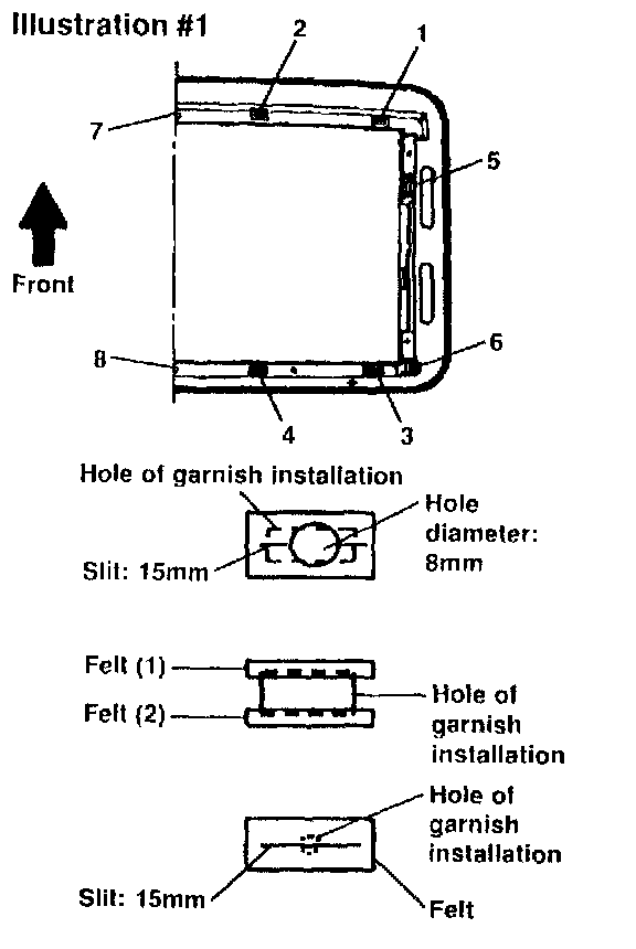 3. Tape 1 piece of felt washer (10 mm x 20 mm x 0.5 mm; 15 mm slit) to locations # 7 and # 8 of the Sliding Glass Roof Assembly.