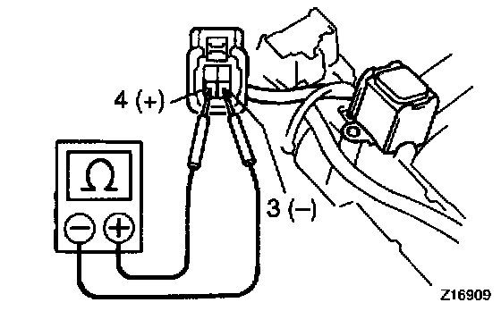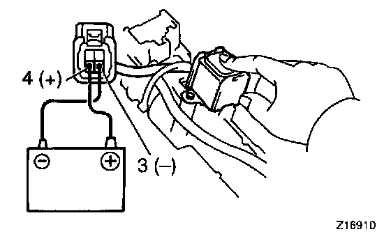 c. Touch the solenoid with your finger and check that the solenoid operation can be felt when battery voltage is applied intermittently to terminals 3 and 4.