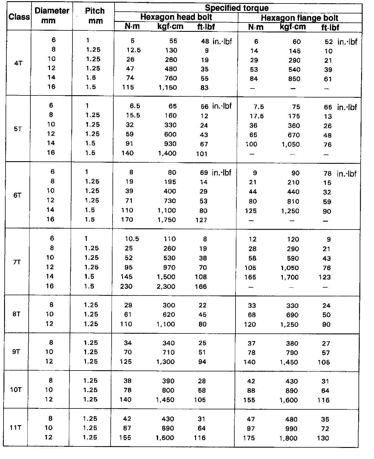 SPECIFIED TORQUE FOR STANDARD BOLTS