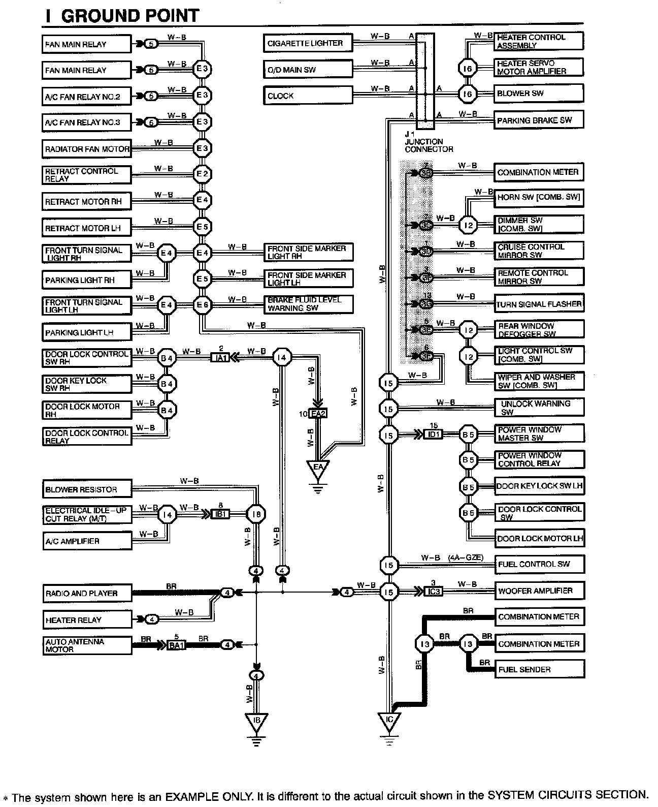 The ground points circuit diagram shows the connections from all major parts to the respective ground points. When troubleshooting a faulty ground point, checking the system circuits which use a common ground may help you identify the problem ground quickly. The relationship between ground points (EA, IB and IC shown below) can also be checked this way.