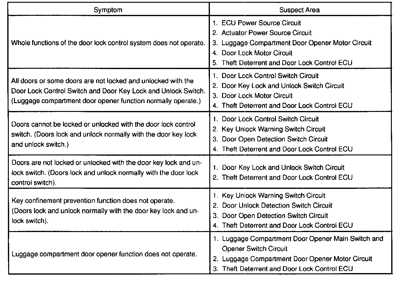 - If the trouble still reappears even though there are no abnormalities in any of the other circuits, then check or replace the Theft Deterrent and Door Lock ECU as the last step.